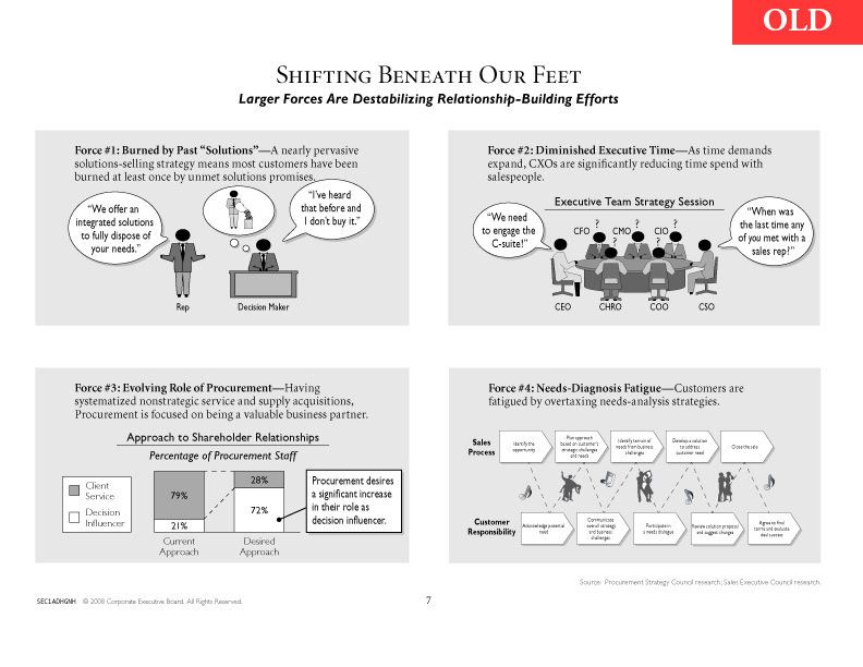 As part of CEB’s rebranding process, the design department was tasked with reworking the templates used for presenting research (in published studies, webinars, meetings, and more). Above, a typical page in the old style.